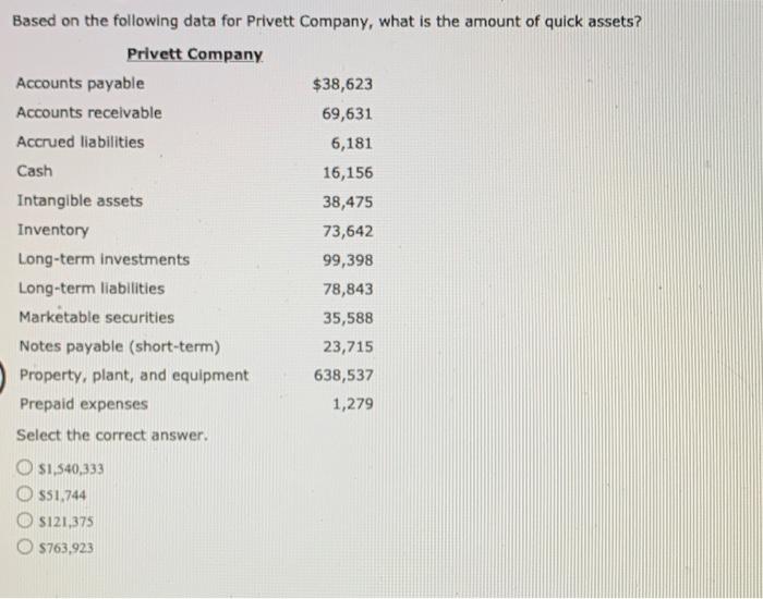 Quick assets include which of the following. Also these securities readily trade in the market and the value of such securities can also be readily determined. Company A has the following asset account balances.